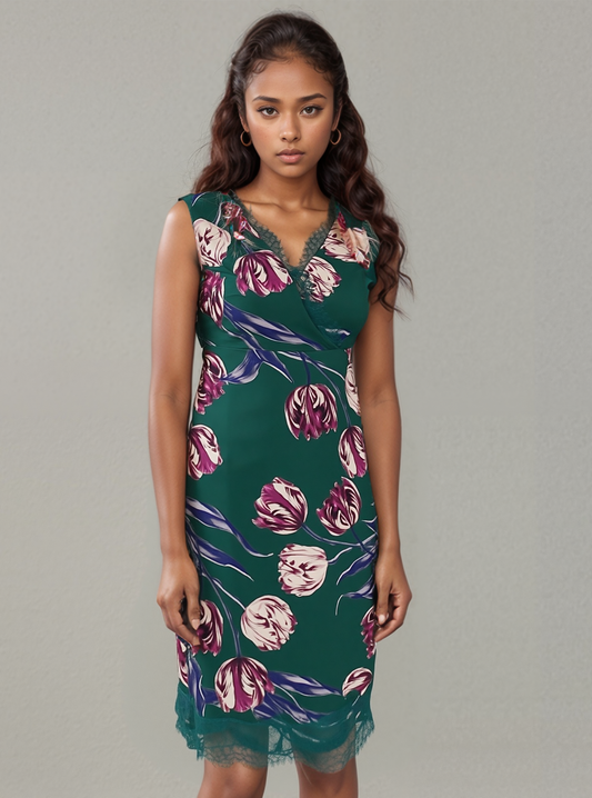 Kiralık Yeşil Lale Desenli Mini Elbise - Bohem ve Zarif Stil