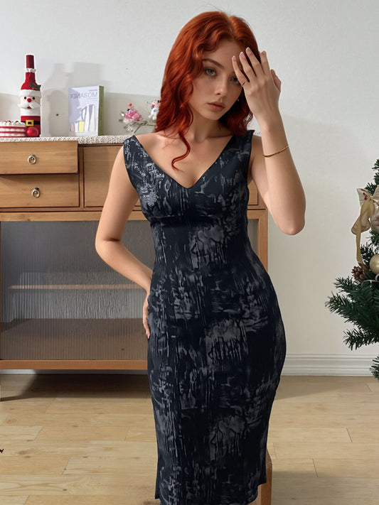 [KİRALIK] Şık Siyah Desenli V Yaka Midi Elbise
