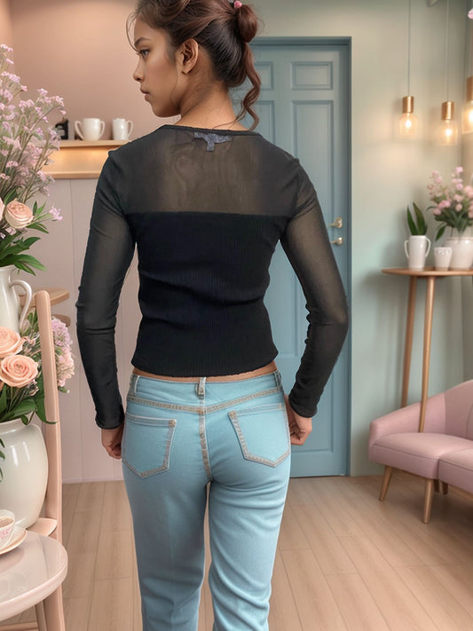 [KİRALIK] Transparan Detaylı Siyah Uzun Kollu Bluz