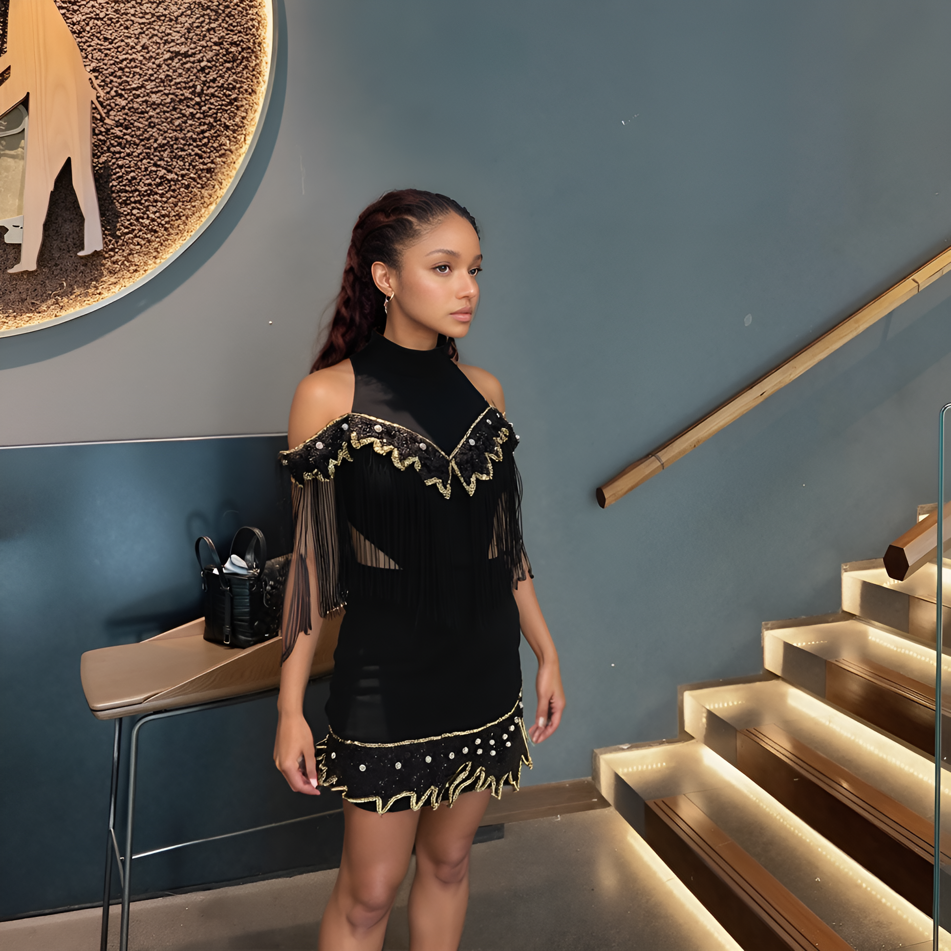 Bu gösterişli ve modern siyah püsküllü mini elbiseyi kiralayarak gecenin yıldızı olun! Hemen rezervasyon yapın ve etkinliğinizde fark yaratın.