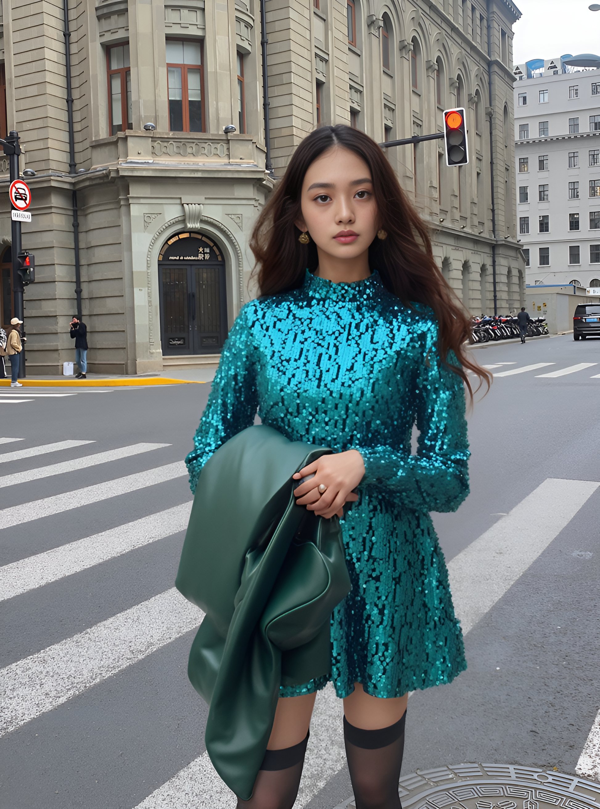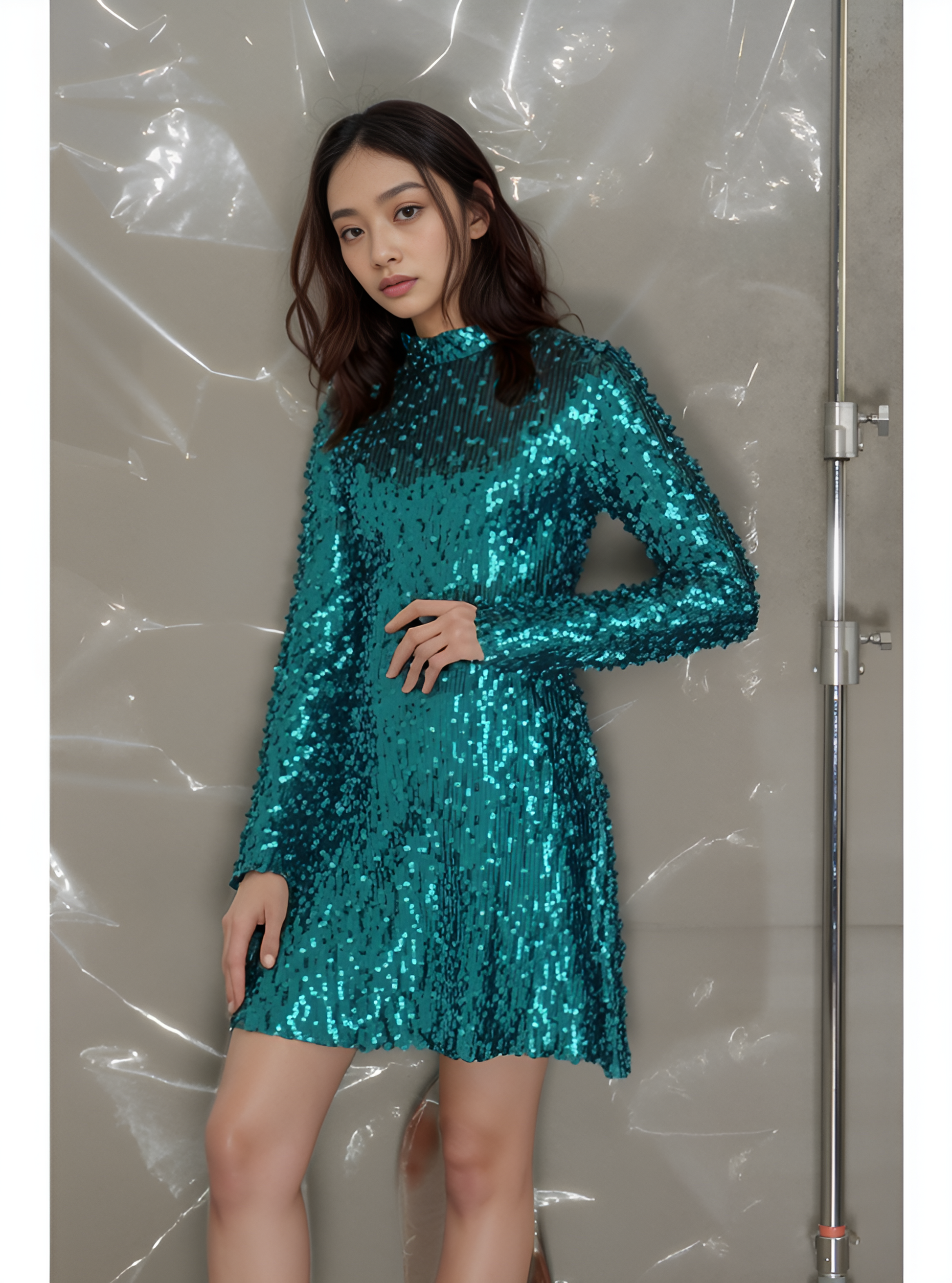 Kiralık yeşil payetli mini elbise, ışıltılı ve şık bir görünüm arayanlar için harika bir seçenek! Bu göz alıcı elbise, canlı yeşil payetleriyle dikkat çekiyor. Yüksek yakalı tasarımı, uzun kollu yapısı ve mini boyuyla feminen bir siluet sunarken, payet detayları gecede parlamanızı sağlıyor. Yılbaşı partilerinden gece davetlerine kadar her özel etkinlikte fark yaratmak için ideal bir parça.