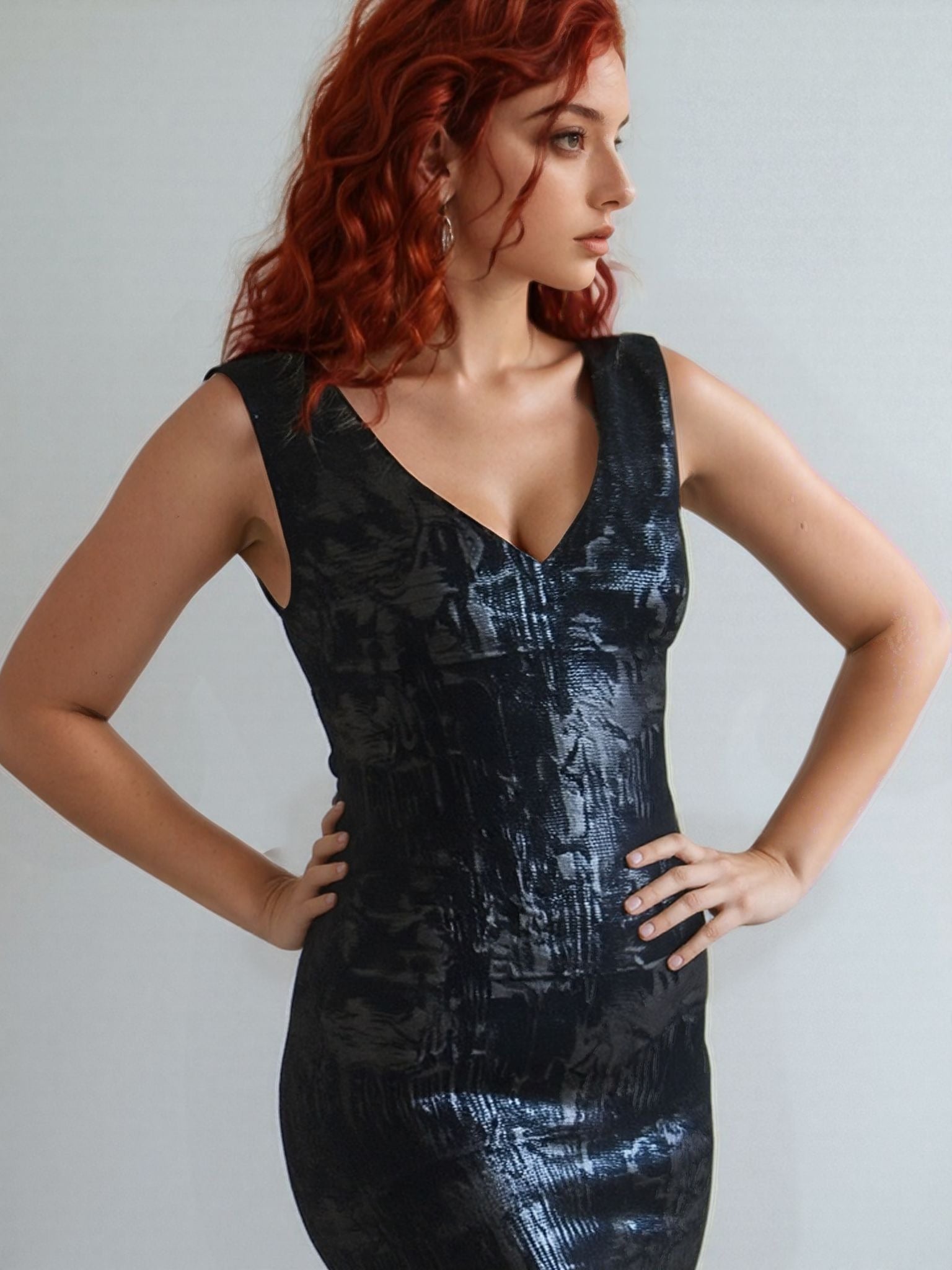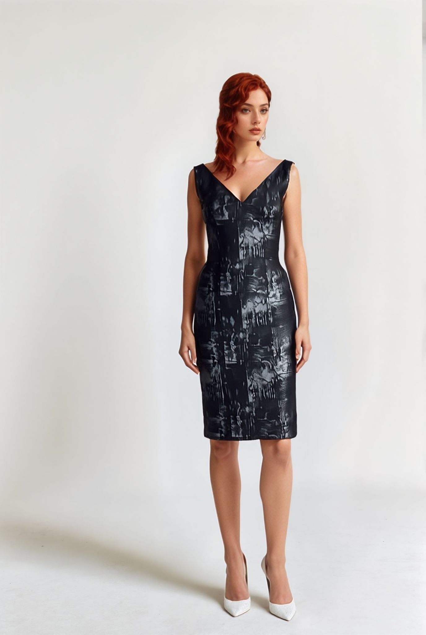 Modern ve zarif bir görünüm arayanlar için tasarlanmış bu şık siyah desenli V yaka midi elbise, özel günlerinizde veya davetlerinizde sizi öne çıkaracak! Elbise, sofistike bir tarz sunan derin V yaka kesimi ve vücudu saran kalıbıyla hem feminen hem de elegan bir duruş sağlar. Üzerindeki soyut gri-beyaz desenler, elbiseye sanatsal bir dokunuş katarak sıradan bir görünümden uzak, dikkat çekici bir stil yaratıyor.
