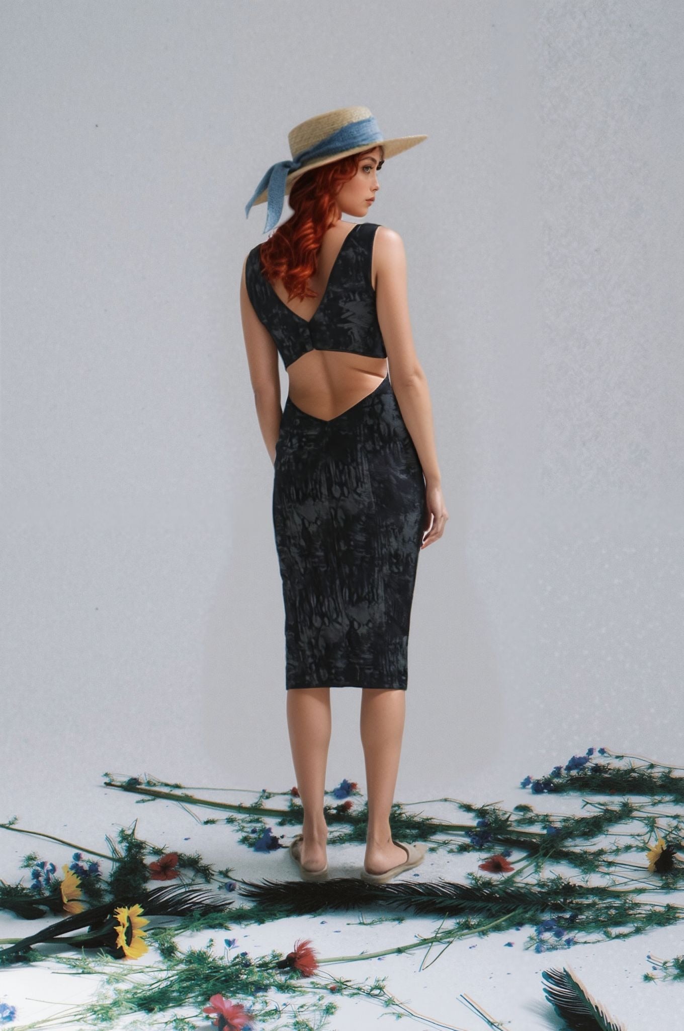 - **Detaylar:** Sırt kısmında derin bir açıklık bulunan tasarım, cesur ve modern bir görünüm sunar. Kol kısmı kolsuzdur, bu da elbiseyi yaz ve bahar ayları için mükemmel bir seçenek haline getirir.